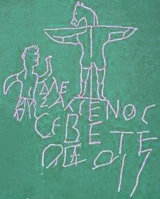 A Rome particulièrement, les martyrs étaient souvent mis sur une croix en forme de T (crux commissa ou crux summissa) comme en témoigne ce dessin de la main d’un enfant. La tête d'âne était une offense blessante à l'égard des chrétiens